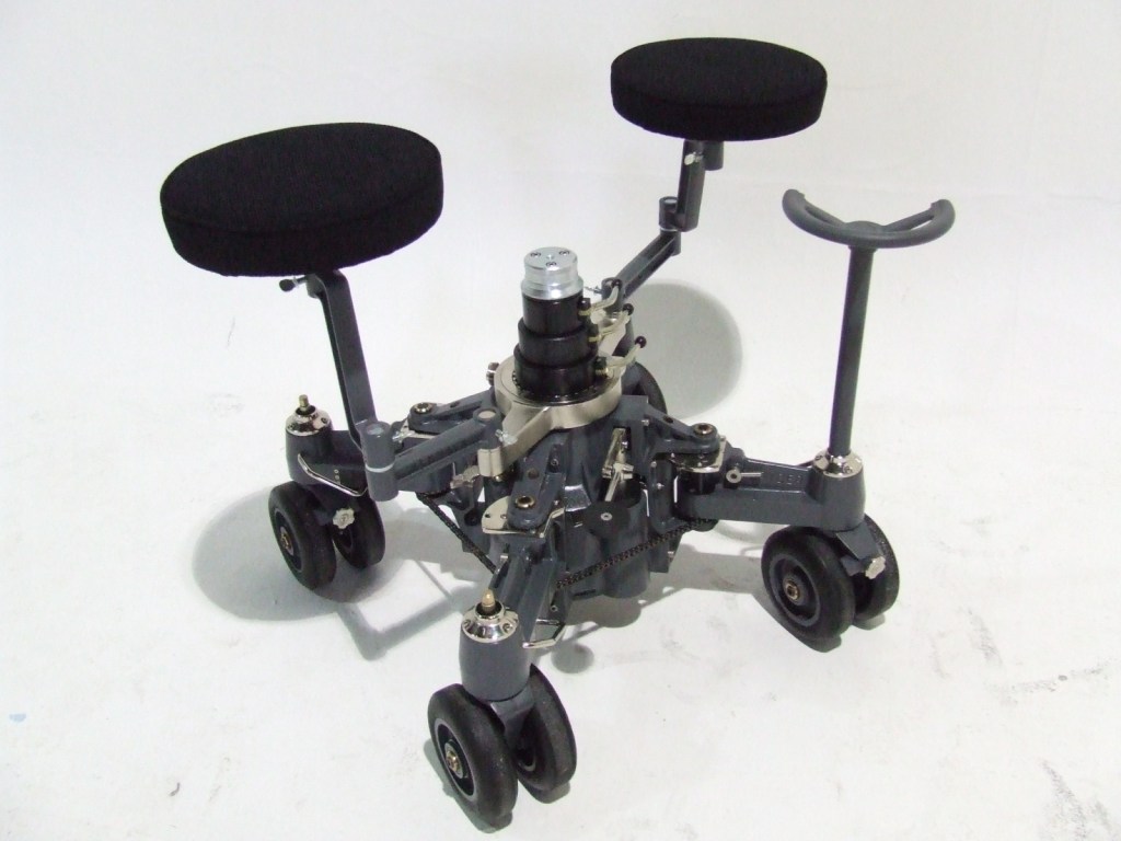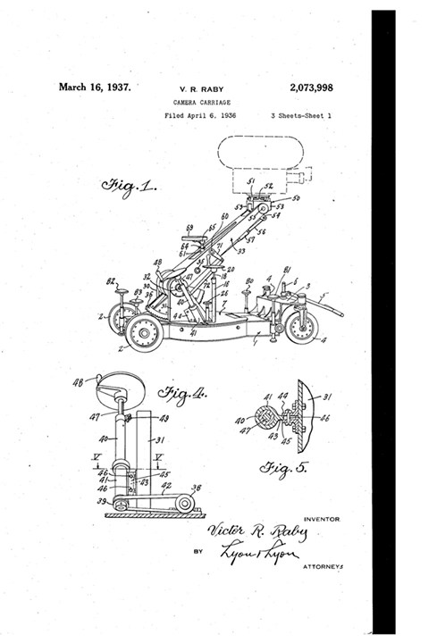 Она имела центральный столб на поворотном столе шириной 4 фута (примерно 1,22 метра) со встроенной редукторной головкой, которая могла устанавливать камеру на любой высоте от 18 дюймов (0,45 метра) до 7 футов (2,13 метра). Камера могла подниматься на столбе для съемок, аналогичных съемкам с крана, а гидравлика управляла панорамированием и наклоном. По окружности основания располагались четыре небольших колеса — два спереди и пара управляемых сзади. Тележка Velocilator компании Twentieth Century-Fox, изготовленная Fearless Camera Co., была легче и имела наклонную стрелу, а не центральный столб. Похоже, что самый ранний патент на тележку был выдан Studio Equipment Co. на «Camera Carriage» изобретателя Виктора Р. Рэйби в 1936 году.